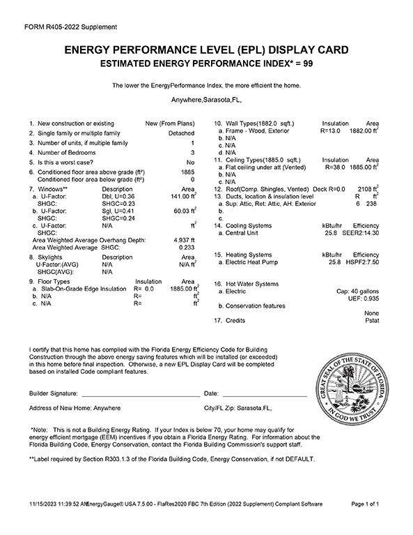2023 8th edition energy performance level (EPL) display card (Note the exact home fails under FBC’s 2023 code).